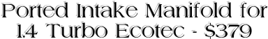 One of the best mods for your 1.4 Turbo as soon as you're tuned! The factory manifold has restrictor plates that block off half the intake runner exit, a ported unit removes this huge restriction. Feedback from the Cruze forum suggests this mod is worth about 15 wheel horsepower once tuned. Our ported manifold uses a brand new manifold and comes with new seals. This is an outright purchase, you don't need to send in your factory manifold. Coming Soon! BACK TO PRODUCT LISTINGS |